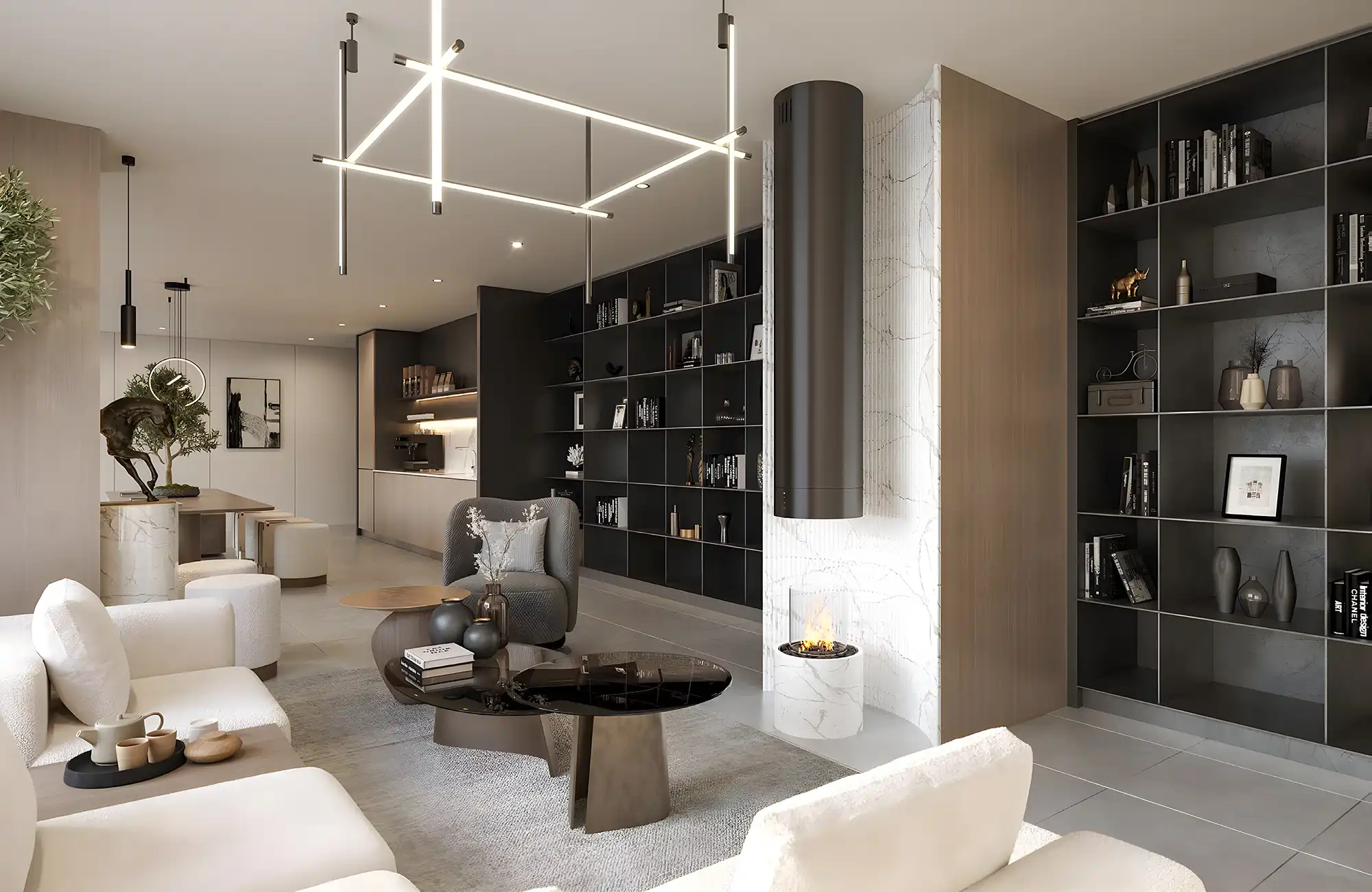 Rosehill by Emaar Properties este un nou proiect rezidențial amplasat în inima comunității Dubai Hills Estate, cu vedere directă către terenul de golf. Acest complex ambițios include două turnuri rezidențiale elegante și un clubhouse cu regim redus de înălțime, poziționat pe un podium. Fațadele clădirilor, cu linii geometrice curate și verticale, reflectă ritmul fairway-urilor terenului de golf, în timp ce geamurile panoramice estompează granița dintre spațiul interior și cel exterior. Accesul în complex se face printr-un lobby stilat, cu finisaje din marmură și alamă, candelabre artistice și rafturi de bibliotecă.