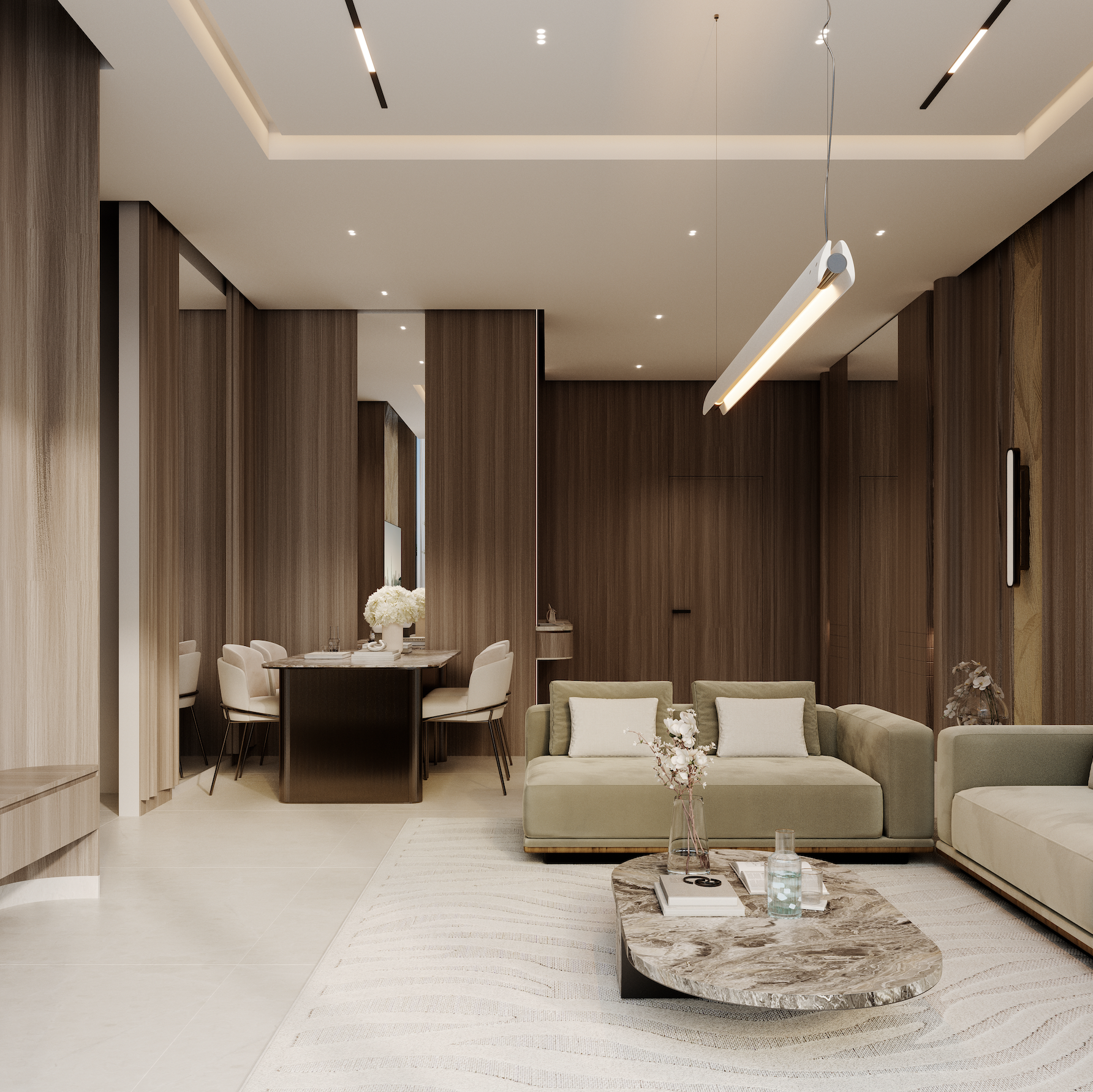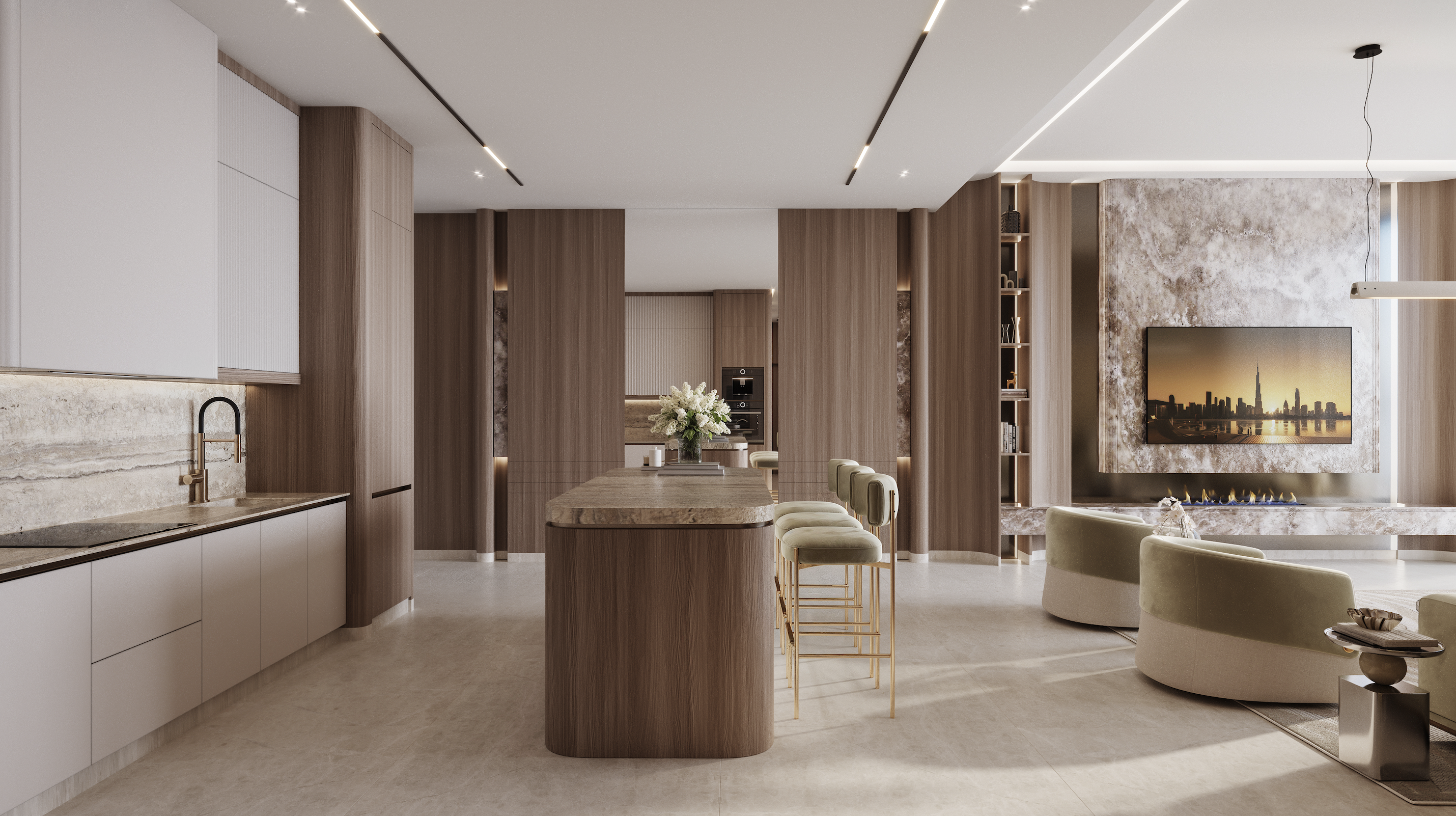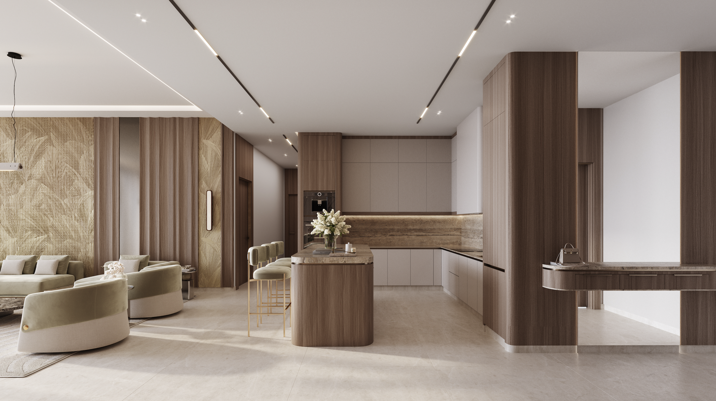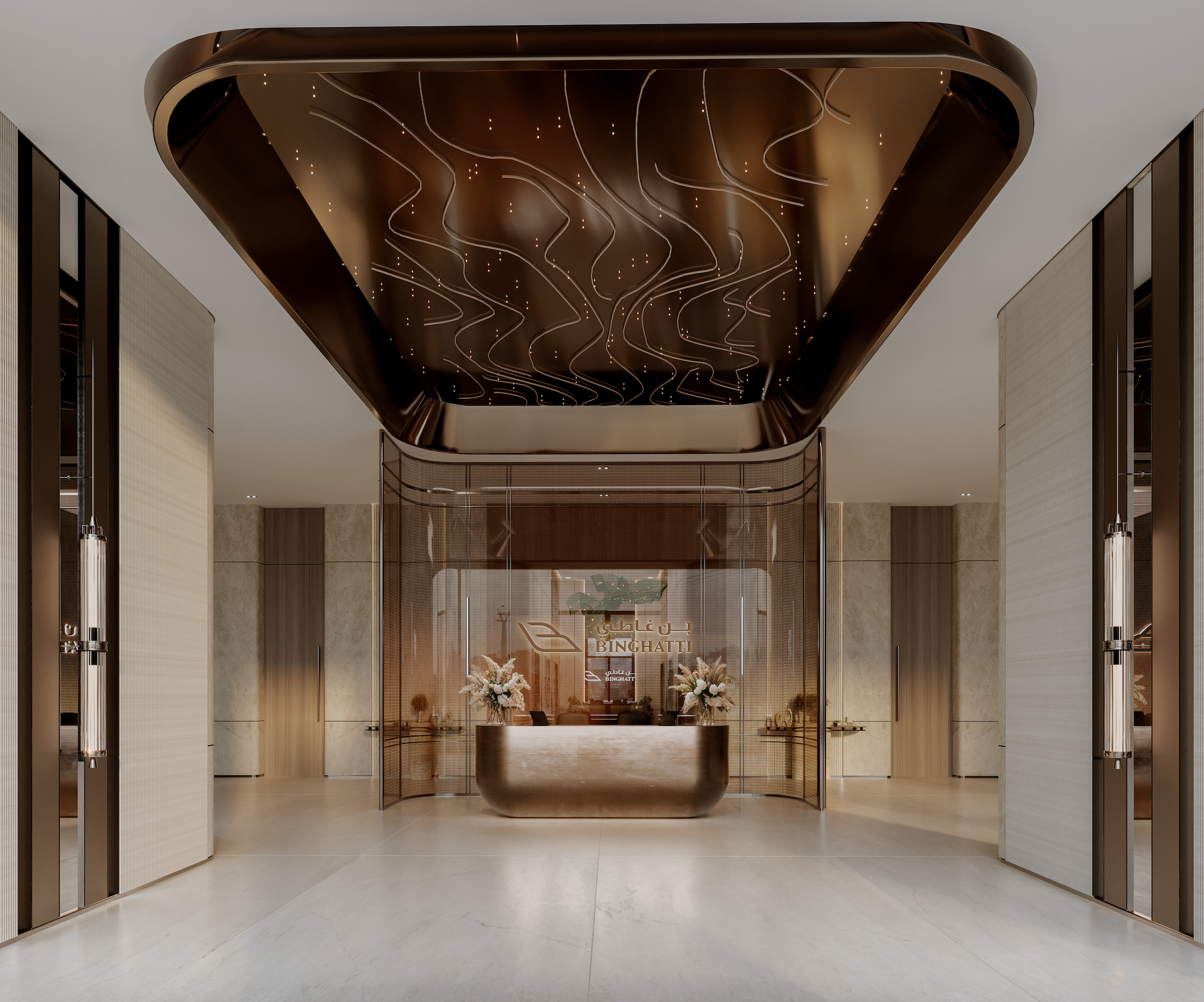 Interioarele apartamentelor din Binghatti Luxuria sunt decorate într-o paletă neutră. Finisajele includ tonuri deschise de lemn, plăci mari cu efect de piatră, panouri texturate fine și detalii metalice elegante. Compartimentările sunt construite în jurul unui living cu bucătărie open-space și zonă de dining. Bucătăria este complet funcțională, cu blat din piatră, spații de depozitare, posibilitatea instalării unui bar și electrocasnice încorporate. Dormitoarele sunt dotate cu dulapuri built-in, iar băile sunt amenajate în culori deschise, cu obiecte sanitare minimaliste.