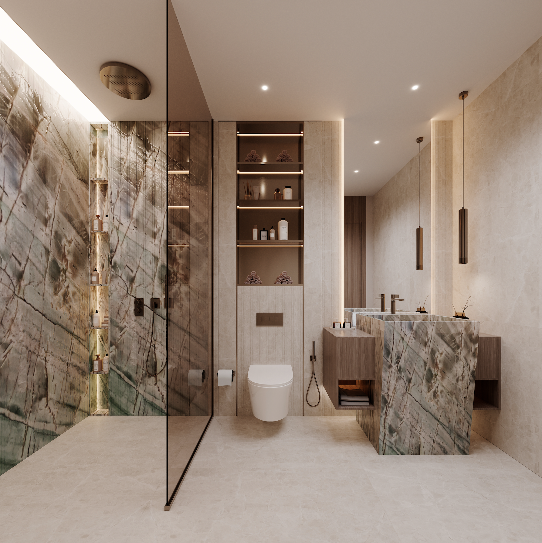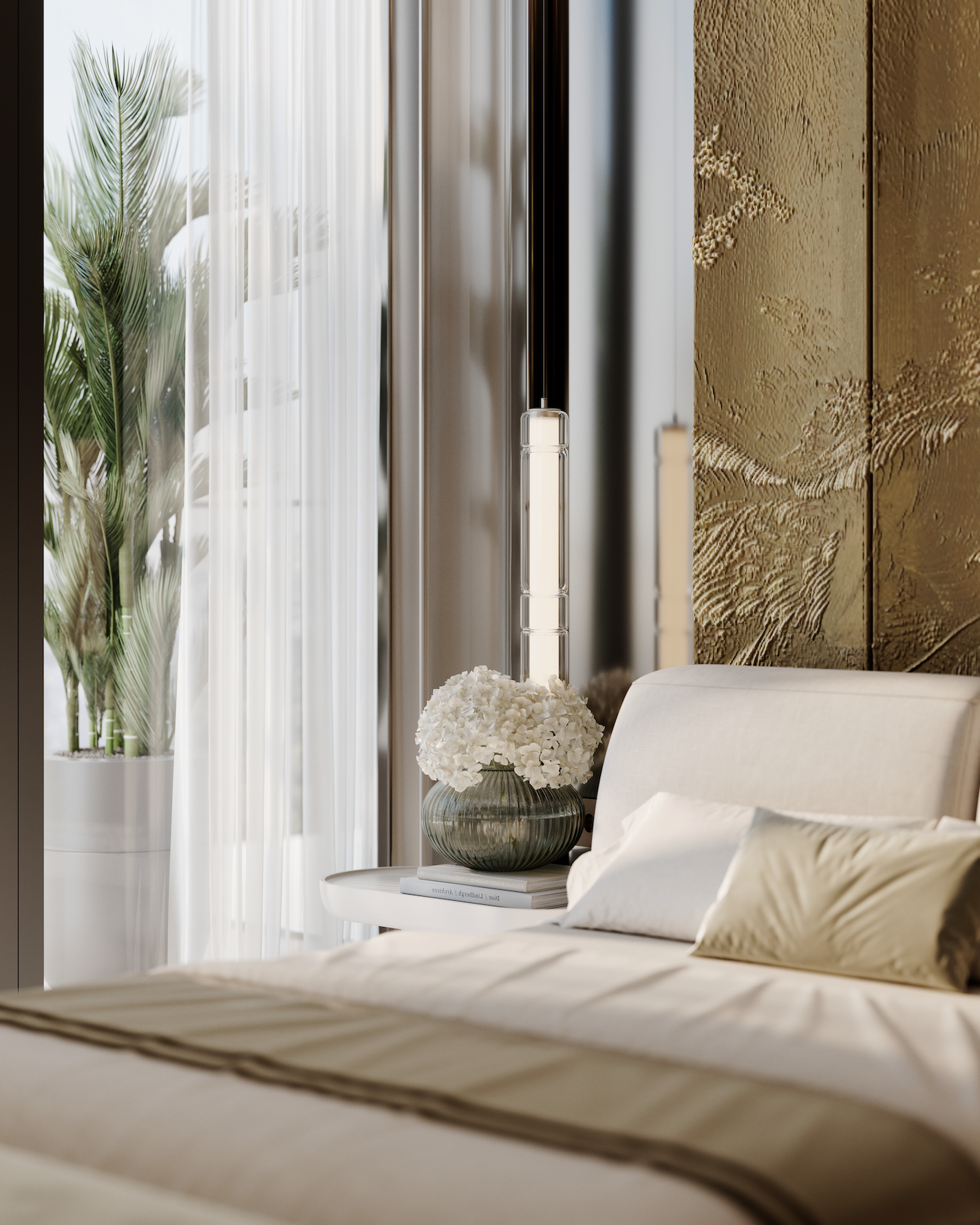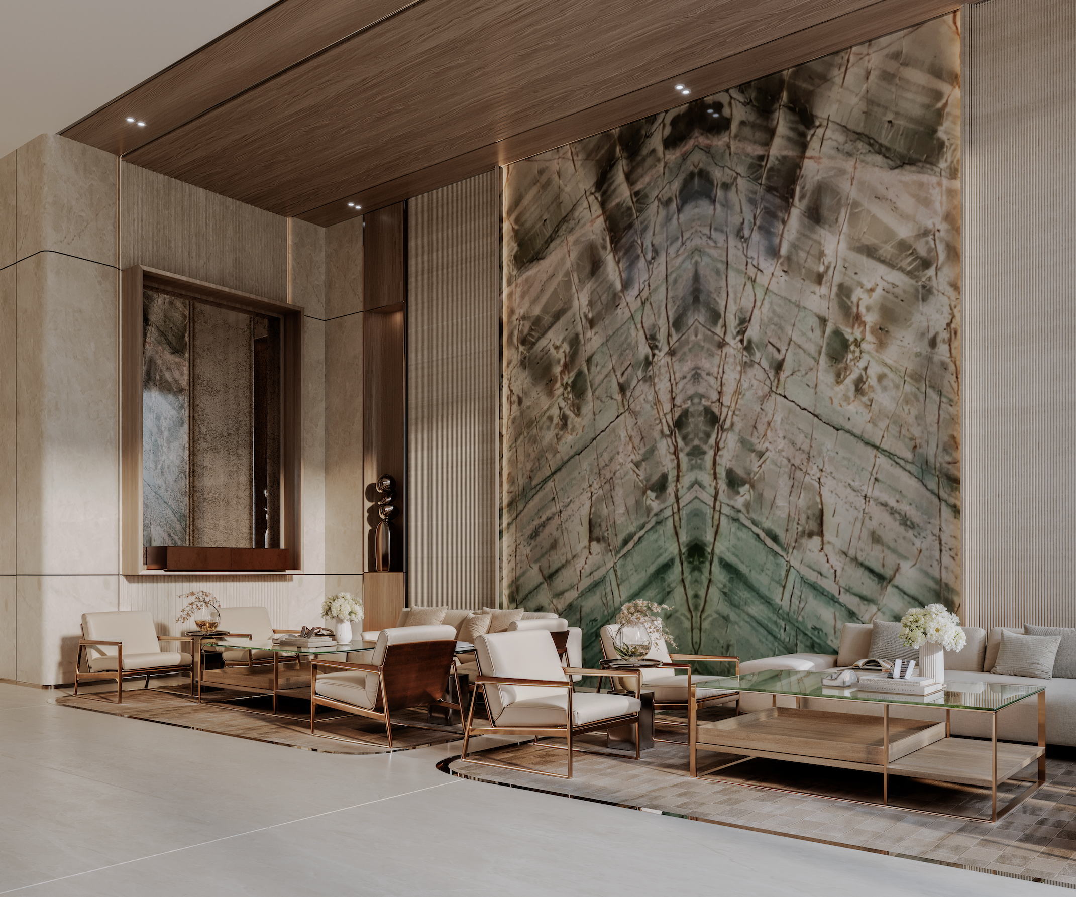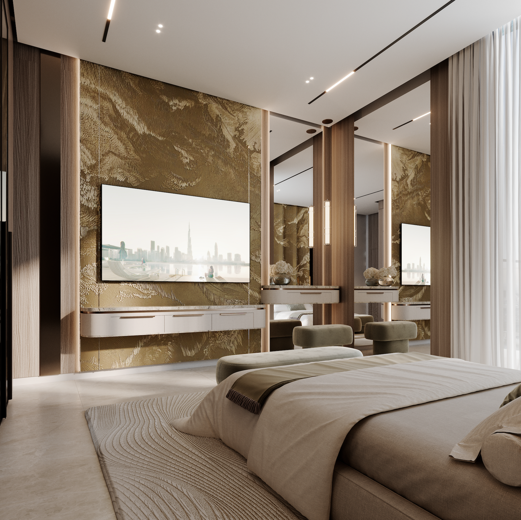Interioarele apartamentelor din Binghatti Luxuria sunt decorate într-o paletă neutră. Finisajele includ tonuri deschise de lemn, plăci mari cu efect de piatră, panouri texturate fine și detalii metalice elegante. Compartimentările sunt construite în jurul unui living cu bucătărie open-space și zonă de dining. Bucătăria este complet funcțională, cu blat din piatră, spații de depozitare, posibilitatea instalării unui bar și electrocasnice încorporate. Dormitoarele sunt dotate cu dulapuri built-in, iar băile sunt amenajate în culori deschise, cu obiecte sanitare minimaliste.
