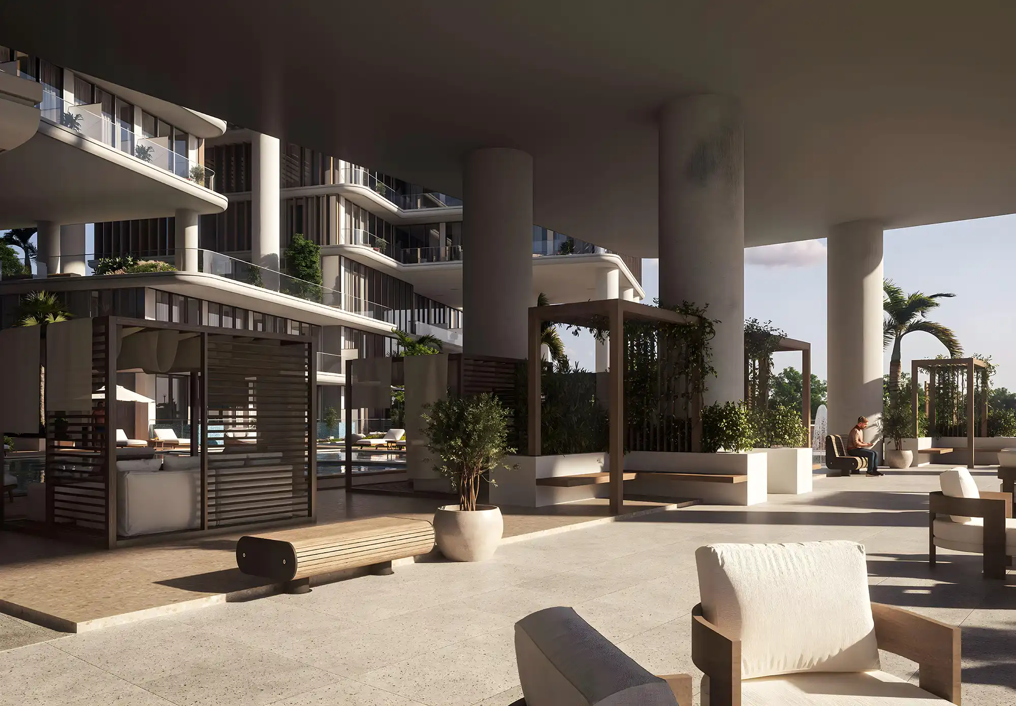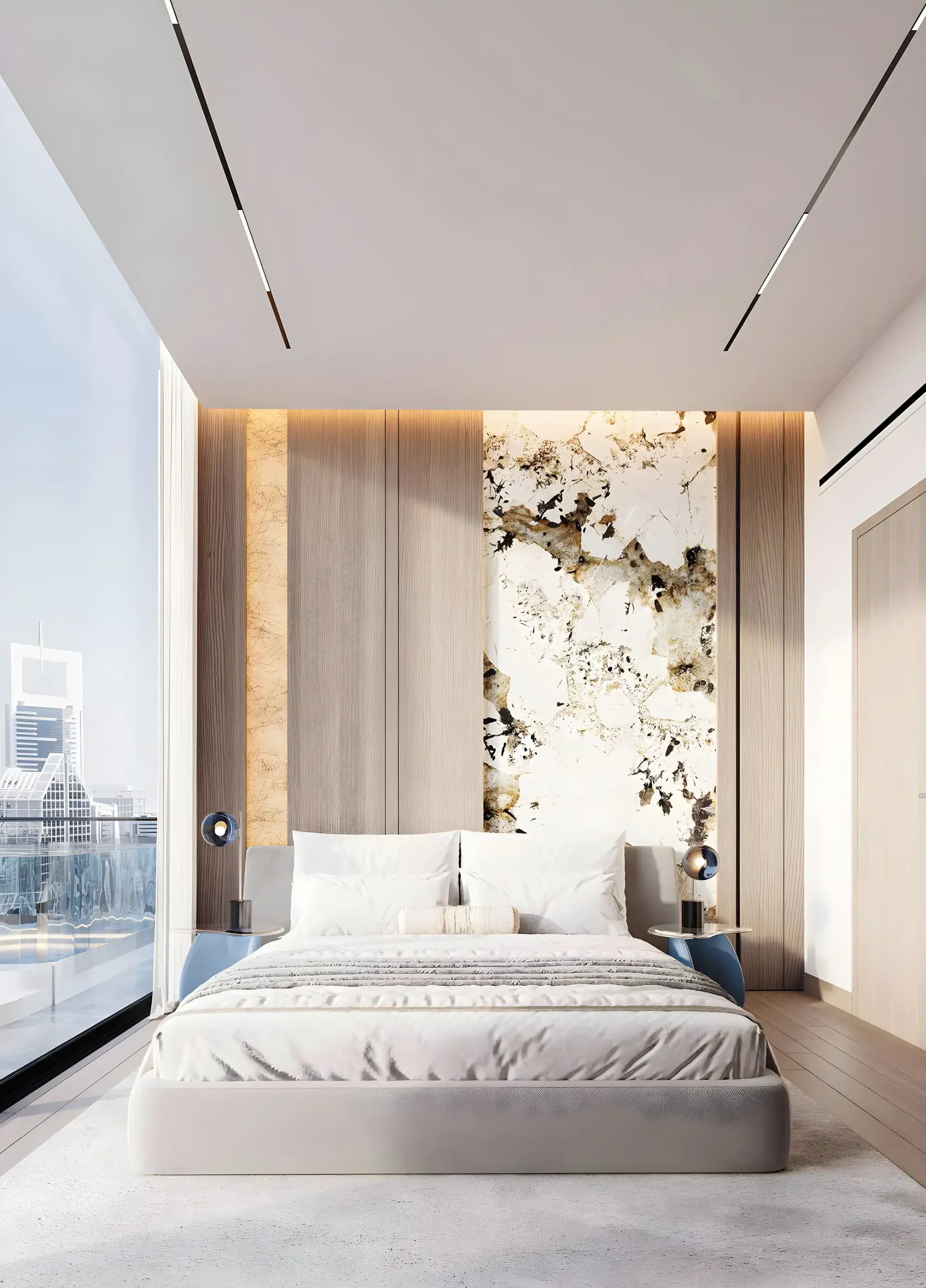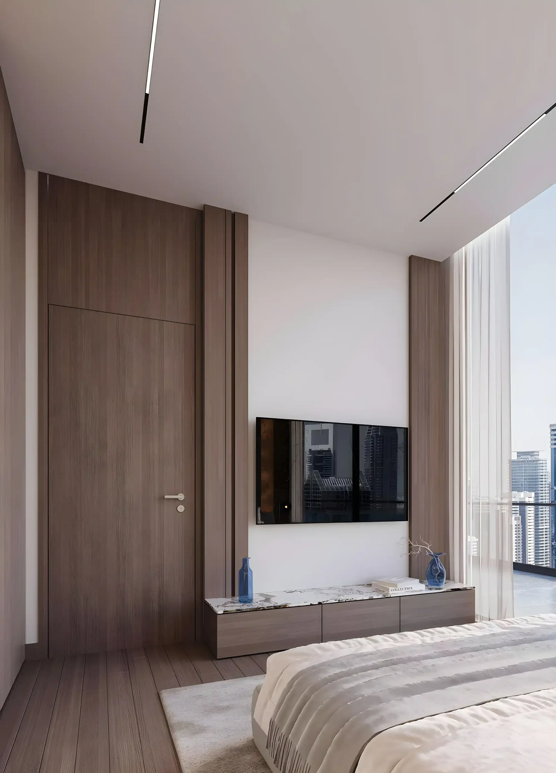 Interioarele acestor apartamente din Dubai South sunt amenajate într-o paletă deschisă, cu texturi simple. Livingul este integrat cu bucătăria, ceea ce face spațiul potrivit atât pentru socializare, cât și pentru lucru. Bucătăriile sunt open-space, cu spații de depozitare și blaturi funcționale. Dormitoarele au ferestre mari și dulapuri încorporate, iar băile sunt dotate cu cabine de duș din sticlă și finisaje deschise.
