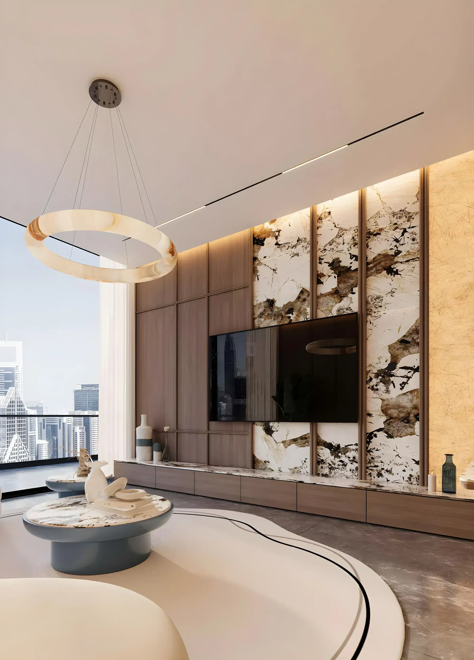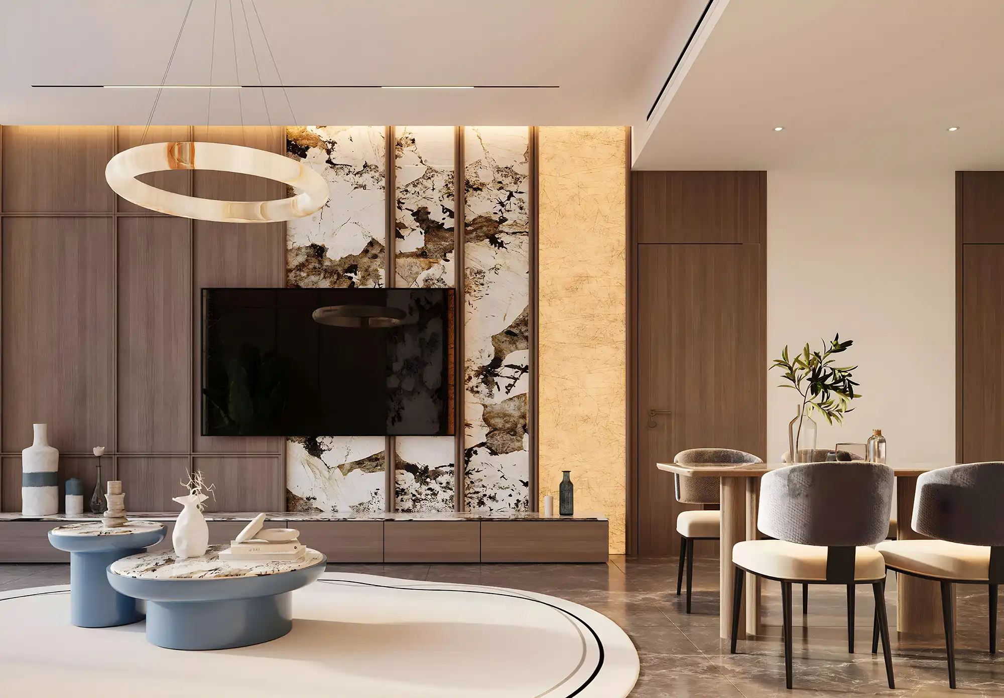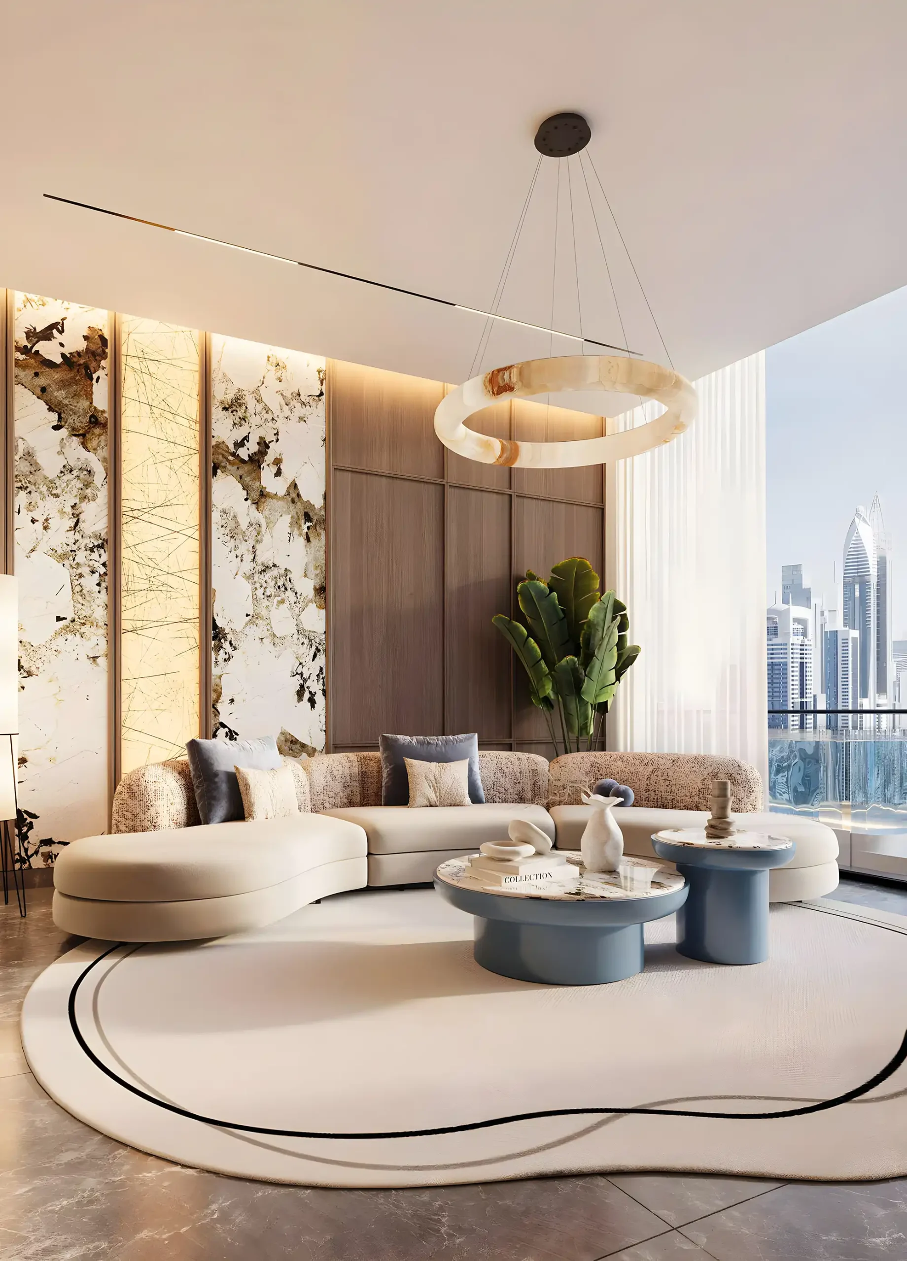 Interioarele acestor apartamente din Dubai South sunt amenajate într-o paletă deschisă, cu texturi simple. Livingul este integrat cu bucătăria, ceea ce face spațiul potrivit atât pentru socializare, cât și pentru lucru. Bucătăriile sunt open-space, cu spații de depozitare și blaturi funcționale. Dormitoarele au ferestre mari și dulapuri încorporate, iar băile sunt dotate cu cabine de duș din sticlă și finisaje deschise.